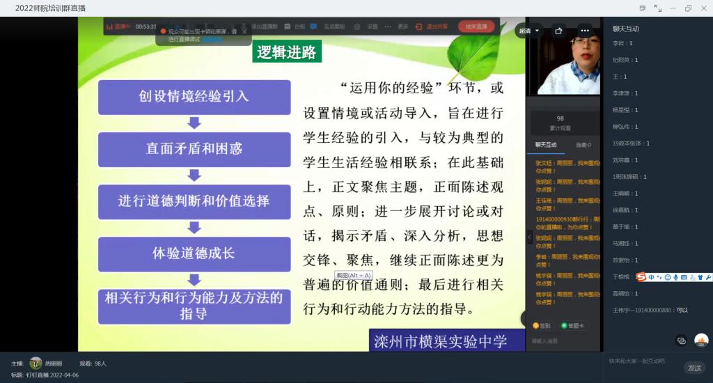 为进一步提高师范生综合素质,切实做好2022年春季学期实习工作,不断提高师范生培养质量。人人看人人干于2022年4月6日上午以钉钉直播的方式举办了师范生“名师课堂”首场活动。滦州市横渠实验中学高级教师、唐山市骨干教师周丽丽老师应邀以《<道德与法治>七年级(上)教材解读》为题,为人人看人人干2019级思政本科和2020级、2021级公费师范生作了报告。人人看人人干胡志洋老师主持活动。