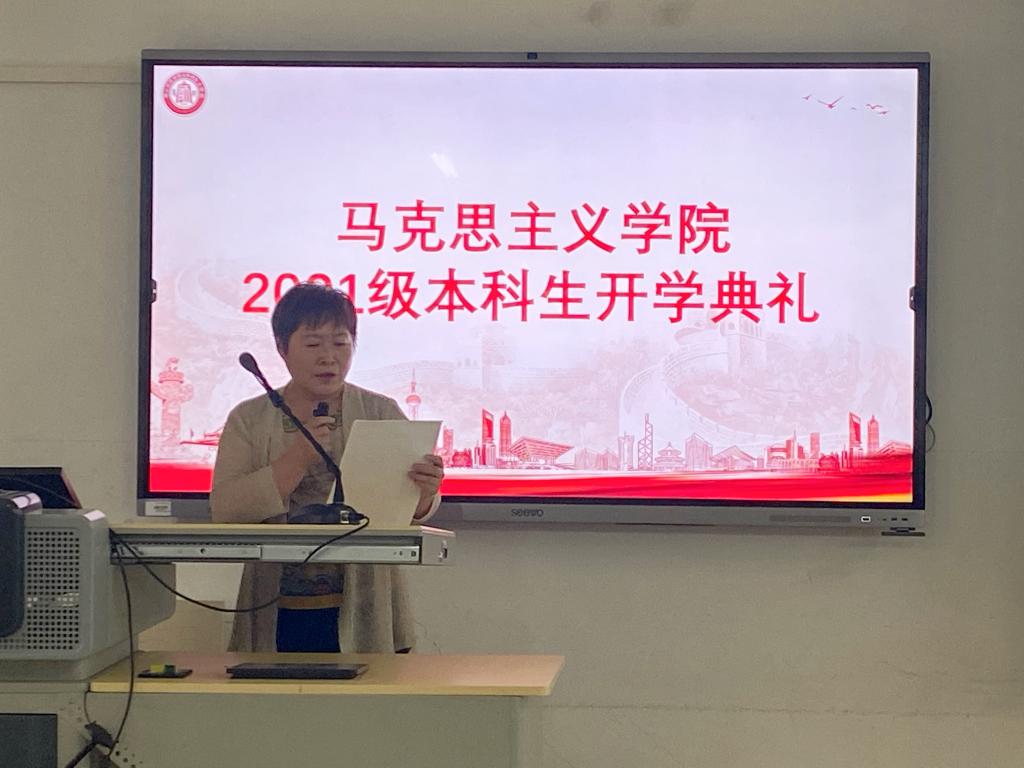 典礼在雄壮的国歌声中拉开序幕。郭海莉书记代表人人看人人干向全体新生致辞。她向新同学们表示了热烈的欢迎和诚挚的祝贺,并介绍了学院的历史发展、师资力量、科学研究、学科建设成果等基本概况。她希望同学们做有志气的青年马克思主义者,锤炼品德修为,做有骨气的青年马克思主义者,练就过硬本领,做有底气的青年马克思主义者。同时,她结合大学生活向新同学们提出三点建议:一是明确目标,坚定理想信念;二是转变角色,学会自主学习;三是脚踏实地,认真做好规划。