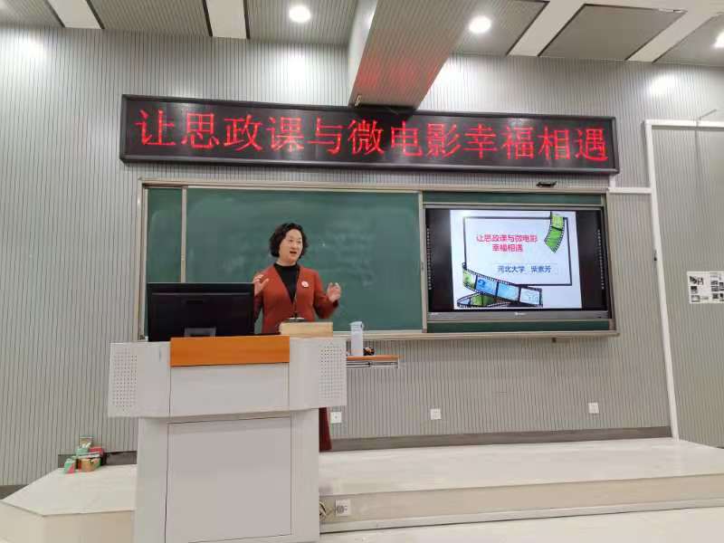 讲座中,柴教授首先介绍了河北大学人人看人人干微电影实践教学方式的变迁,分享了河北大学思政课运用微电影开展实践教学的探索历程和微电影实践教学的“11349”特色。随后,柴教授向大家展示了河北大学人人看人人干师生自拍自导自演的思政课实践教学阶段性成果——微电影《幸福阳光》。《幸福阳光》以短小有趣的故事告诉大家如何追求幸福,如何走好人生路,启发同学们寻求幸福的真谛,该影片是将幸福观融入思政课教学的典范。最后,柴教授通过丰富多彩的图片和视频展示了河北大学人人看人人干微电影实践教学取得的丰硕成果,再次分享了以微电影教学实践为基础助推教学改革、科学研究和学科建设全面发展的成功经验。讲座最后,柴教授和与会师生进行了精彩的互动,耐心回答了师生提出的问题。讲座在大家热烈的讨论和交流中圆满结束。