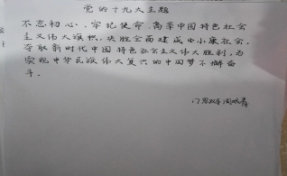 比赛开始前主持人介绍了写好两笔字对提高自己职业能力的重要性问题,并依次介绍了评分标准及比赛规则。随即宣布社会科学部两笔字比赛正式开始。首先,比赛内容为硬笔字书写,书写内容为十九大会议主题,同学们在提前备好的硬笔字书法纸上认真书写,在此期间各位评委下台浏览,十分钟结束后主持人宣布同学们停笔并将自己的比赛作品放好,接着由每列最后一位同学依次往前收,收齐后统一交给评委审阅。之后又开始了粉笔字比赛,粉笔字书写内容为龚自珍的《己亥杂诗》规定时间为十分钟,学生们站起来认真地写下规范美观的粉笔字,积极投入,大家认真严谨的态度流露在自己脸上。评委们在同学们紧张进行比赛其间不时观看,并进行简要指点,最后学生们主动地用手机记录下自己的书法作品,当同学们满意地看着自己的作品时,评委们逐一讨论,认真观察最终选出获奖作品,此次活动取得了预期的效果。