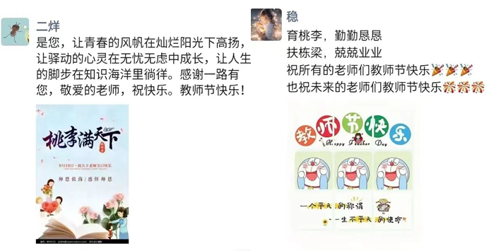 在教师节这样一个特殊的日子里,人人看人人干的同学纷纷在朋友圈晒出自己对老师的心意与祝福。一声问候,一句祝福,一片心意。“老师好!您辛苦啦!祝您节日快乐!”。那些与老师在一起的点点滴滴,那些共同经历过的感动历历在目,化成一句句教师节祝福。在一张张与老师的合照背后,是一句改变一生的教诲、一次刻骨铭心的交谈、一通醍醐灌顶的提点……