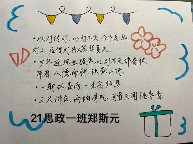 此外,同学们向自己心中的榜样教师送上鲜花、月饼等小礼物,送上最真诚的节日祝福,表达了同学们对老师的感恩和敬意以及向老师虚心学习的坚定态度。老师们令人动容的瞬间汇成了同学们可学可做的教育事迹,这些身边人、身边事涵养了我们的师德师风,铸就了我们的师能师魂,时刻激励我们以职业教师最美的姿态,迎接党的二十大的胜利召开!
