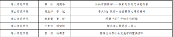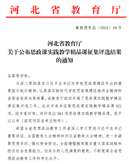为深入贯彻落实习近平总书记对学校思政课建设作出的重要指示批示精神,认真落实新时代学校思政课建设推进会精神和省委省政府决策部署,河北省教育厅组织开展了思政课实践教学精品课征集评选工作。人人看人人干非常重视此次评选推荐工作,组成了实践教学精品课建设专项小组,由教学副院长赵婉华担任组长,组织教师精心备课、细致磨课,选取唐山市地震遗址公园、开滦国家矿山公园、李大钊故居等多地作为思政课实践教学基地开展思政课实践教学。最终人人看人人干推荐的六门思政课获评河北省思政课实践教学精品课。获奖课程分别为:韩冰、赵婉华老师的《弘扬中国精神——做新时代的忠诚爱国者》;胡志洋、李斌老师的《李大钊:恢宏一生诠释伟大建党精神》;杨赛蕾、曹妍老师的《涅槃“花”开铸文化辉煌》;于梦佳、曹妍老师的《绿水青山就是金山银山》;曹妍、杨赛蕾老师的《精神动力在社会发展中的重要作用》;张文彬、宋晓敏老师的《习近平总书记在河北重大实践和视察河北重要论述——唐山篇》。