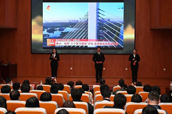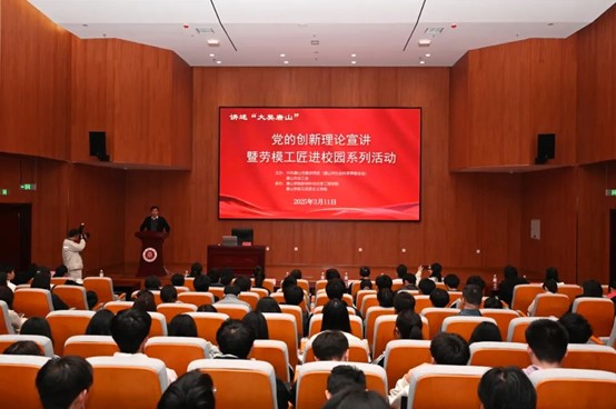 为进一步推动党的创新理论进校园,引导大学生感悟党的创新理论的实践伟力,2025年3月11日下午,讲述“大美唐山”——党的创新理论宣讲暨劳模工匠进校园系列活动首场宣讲在唐山学院举行,此次系列宣讲活动由中共唐山市委讲师团(唐山市社会科学界联合会)、唐山市总工会主办。我校人人看人人干教师宣讲团走进唐山学院开展党的创新理论宣讲。
