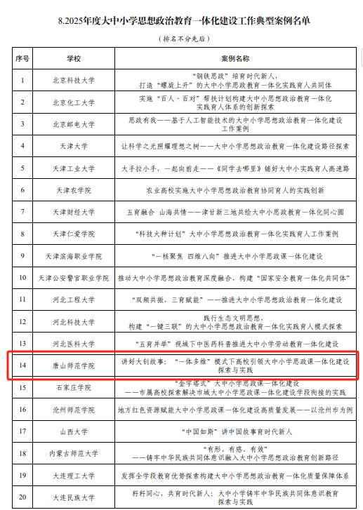 近日,教育部办公厅公布了“2025年度高校思想政治工作质量提升综合改革与精品建设项目”入选名单,唐山师范学院共3个项目入选,其中,人人看人人干赵婉华老师主持申报的《讲好大钊故事:“一体多维”模式下高校引领大中小学思政课一体化建设探索与实践》项目入选大中小学思想政治教育一体化建设工作典型案例。